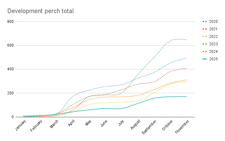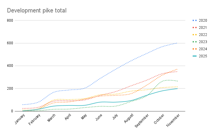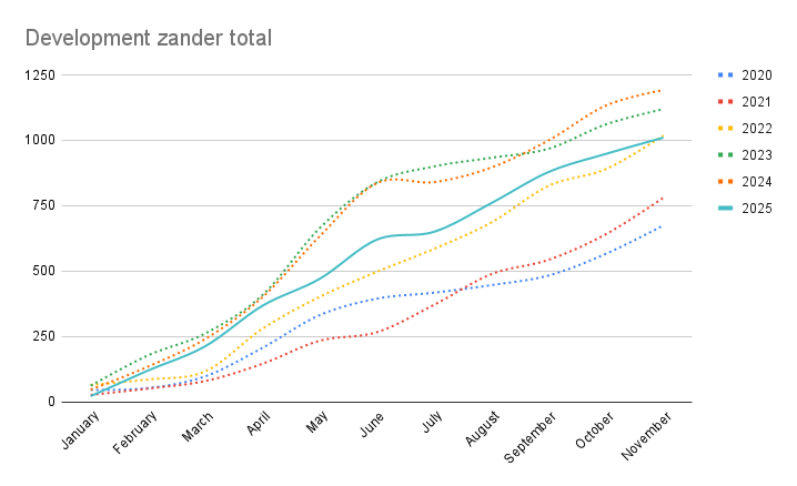 Het jaar 2025 liet zien hoe sterk de praktijk kan afwijken van langjarige gemiddelden. Sinds 2020 houd ik dagelijks de vangsten bij van iedere snoek, snoekbaars en baars. Die cijfers vertellen hun eigen verhaal: 2020, 2023 en 2024 waren topjaren, met al in november ruim boven de 1800 vissen. 2021 en 2022 waren beduidend minder, rond de 1500 vissen eind november. Maar 2025 spant de kroon — in negatieve zin. Eind november staan we op een bedroevend totaal van nog geen 1400 vissen.